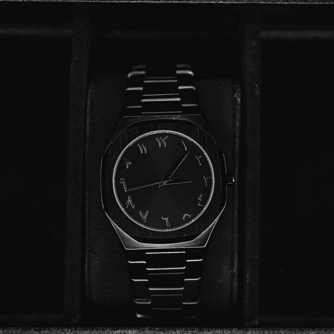 The Black Aura Watch in pure stainless steel is a sleek and stylish timepiece that exudes elegance and sophistication. Its matte black finish and Arabic-inspired design make it a perfect blend of traditional and modern innovation.